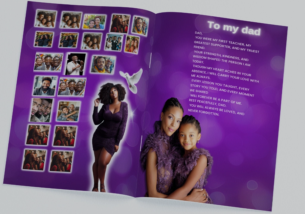 Create a beautiful 8-page memorial tribute in minutes — print at home or professionally.