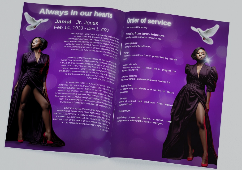 Celebrate the cherished memories of your loved ones with our creative obituaries. Our elegant PURPLE SPARKLING and WHITE Obituary Template for women and men honor lives and create lasting tributes. Craft a fitting memorial with our Funeral Program Canva Template. Instantly access the template after purchase.