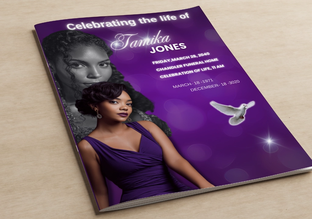 Purple Sparkling Obituary Template: Celebration of Life, Funeral Program (8.5×11 Canva, 8 Pages)